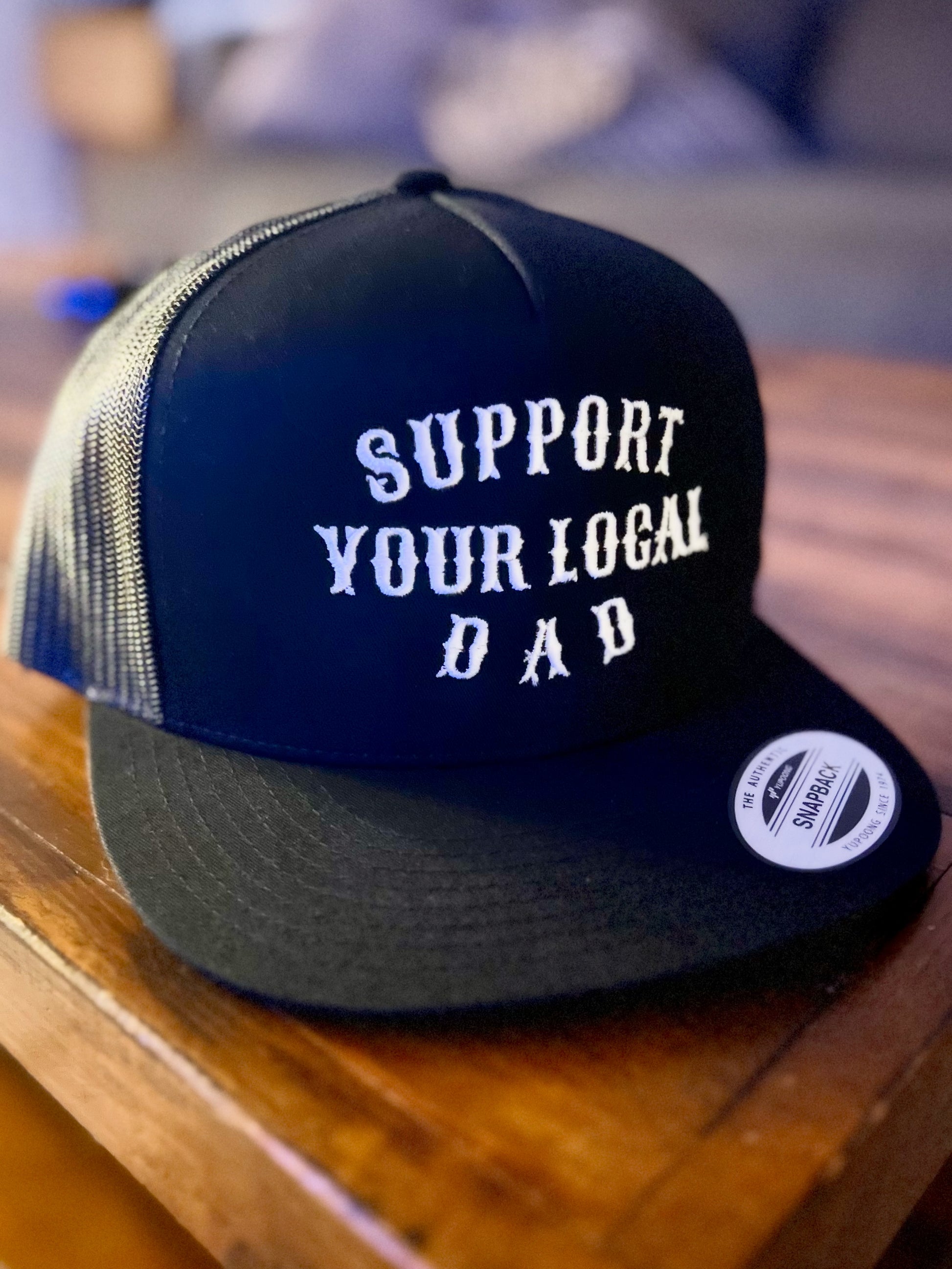 Classic 5-panel Yupoong 6006 snapback built for comfort and attitude. Structured front with premium white “Support Your Local Dad” embroidery. Breathable mesh back keeps it cool from jobsite to coastline. Flat bill, adjustable snap closure, and a medium-high crown that holds its shape.